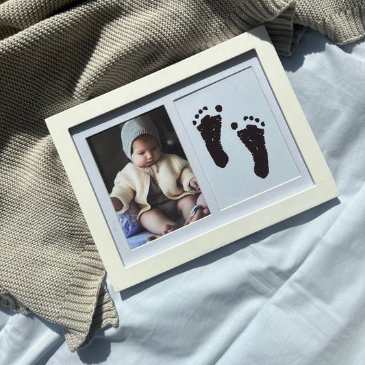 Baltas rėmelis su kūdikio rankos/pėdos įspaudu