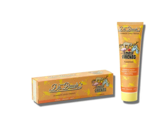 Dr.Bauer’s vaikiška dantų pasta apelsinų ir mėtų skonio Flamingo, 90 ml.
