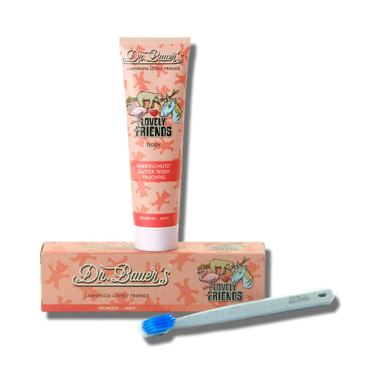 Dr.Bauer’s vaikiška dantų pasta braškių ir mėtos skonio Teddy, 90 ml.