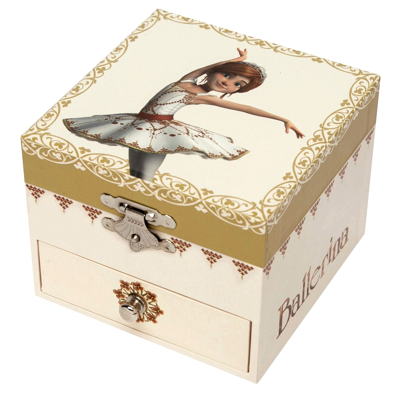 Ši nuostabi muzikinė dėžutė maloniai nustebins kiekvieną mergaitę. Tai tarsi mergaitės vaikystės simbolis, kuriame slepiasi svajonės, paslaptys bei noras puoštis. Dėžutė puikiai tinka dovanai, nes tampa nuostabiu vaikystės prisiminimu. Pasukite raktelį ir figūrėlė tarsi atgis, užliedama aplinką nuostabiais klasikiniais muzikos garsais. Ši muzikinė papuošalų dėžutė tarsi nesenstanti klasika, puikiai puošianti mergaitės kambario interjerą. Išmatavimai: 10,5 x 8,5 x 10,5 cm.