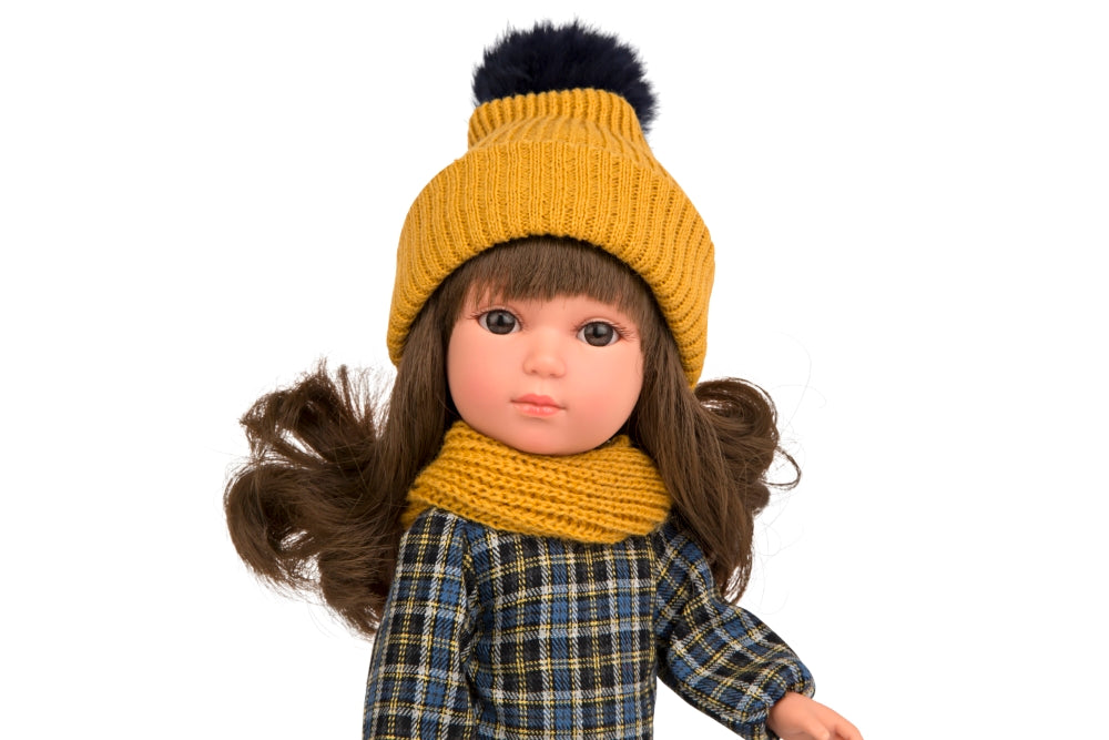 - Lėlytė aprengta stilinga, languota suknyte, ir užrišamais, juodais, odiniais mokasinais. Stilinga kepuryte ir šalikėliu.