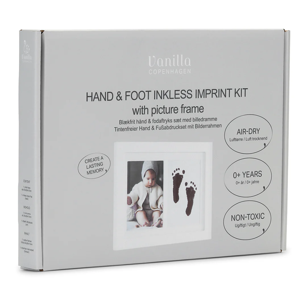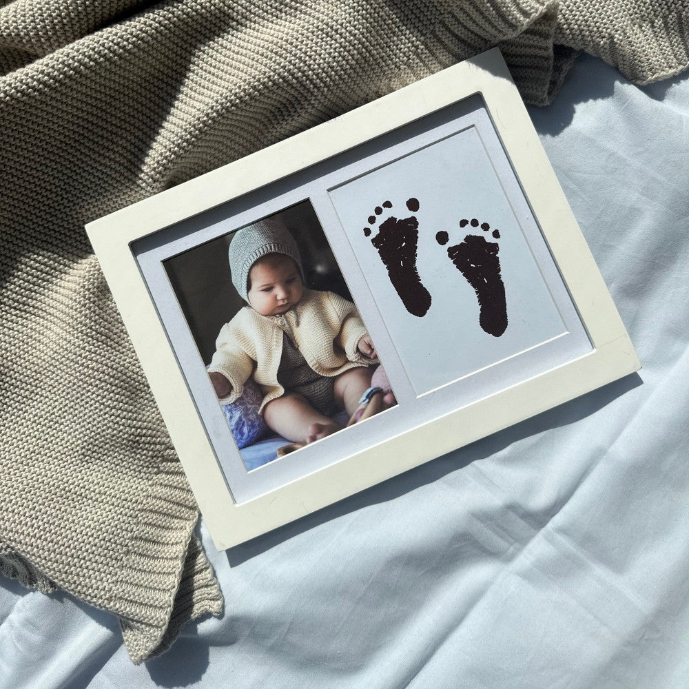 Baltas rėmelis su kūdikio rankos/pėdos atspaudu.