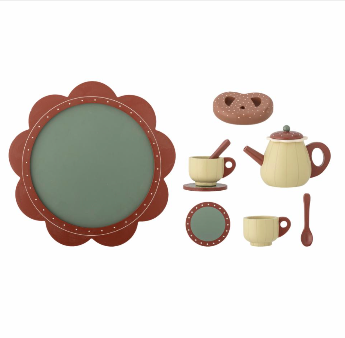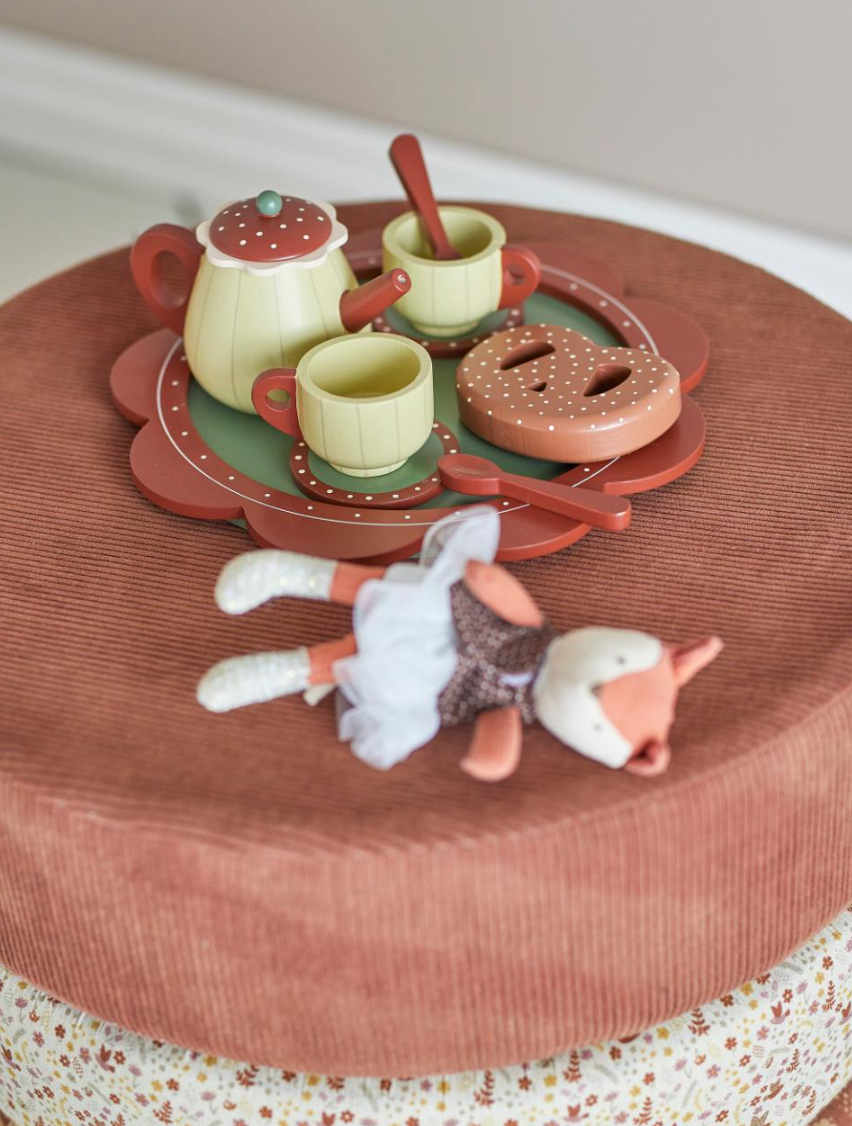 Bette žaidimų rinkinys - tai puikus pasirinkimas mažiesiems, mėgstantiems žaisti su lėlėmis ir kviečiantiems draugus į arbatėlę. Šis žaismingas ir jaukus rinkinys, pagamintas iš FSC sertifikuoto medžio, suteiks jūsų vaikui valandų valandas kūrybingo žaidimo. Rinkinį sudaro 9 dalys, įskaitant padėkliuką, arbatinuką, puodelius, lėkštutes, šaukštelius ir netgi preclį, kad mažylis galėtų suorganizuoti savo pirmąją tikrą arbatėlę. Švelnios, ramios spalvos ir natūralūs medžiagų tonai leis lengvai integruoti šį rinkinį į vaikų kambarį, suteikiant jam jaukumo ir šilumos.