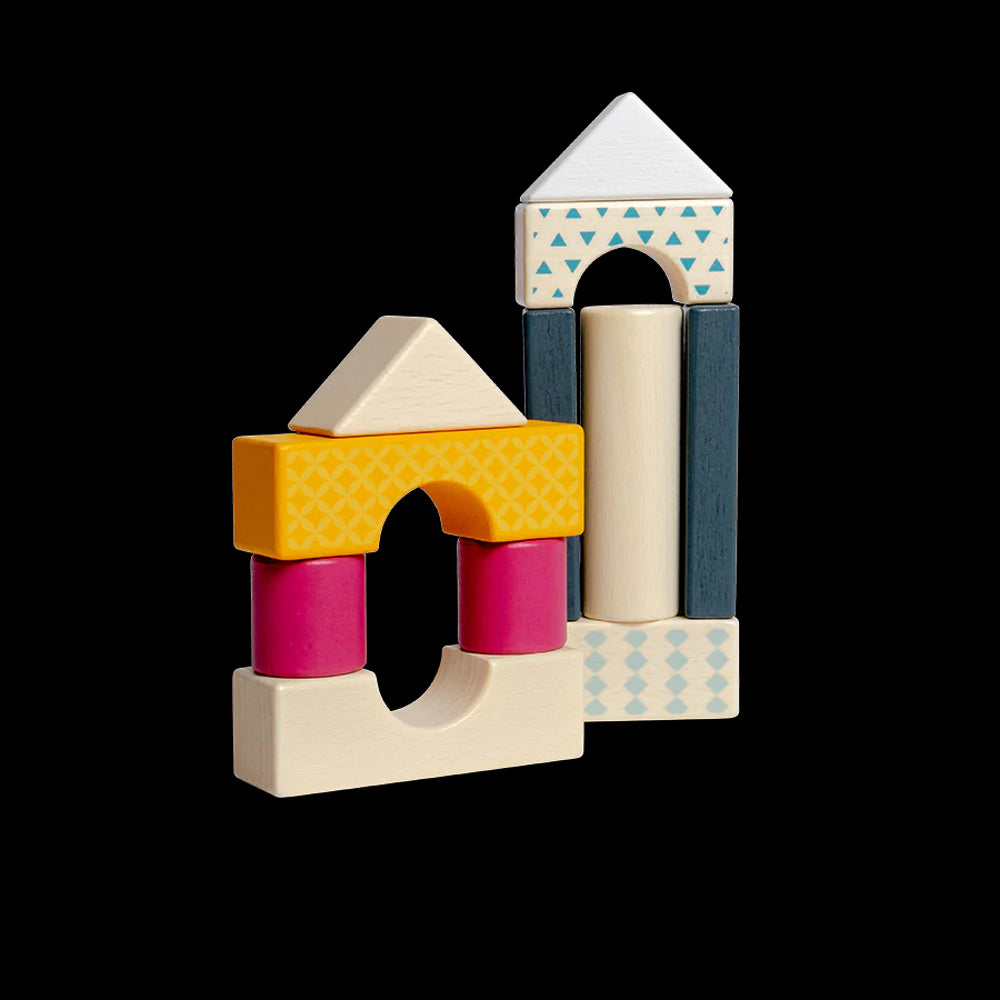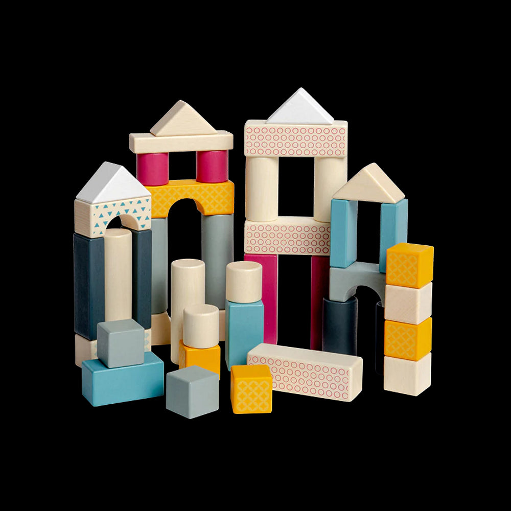 - 50 skirtingų formų ir spalvų medinės kaladėlės;