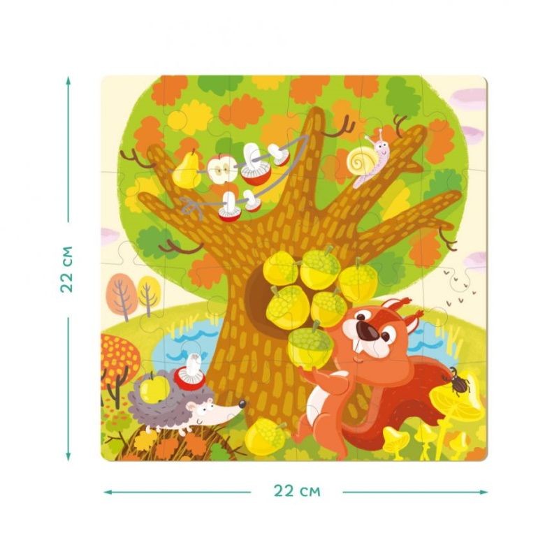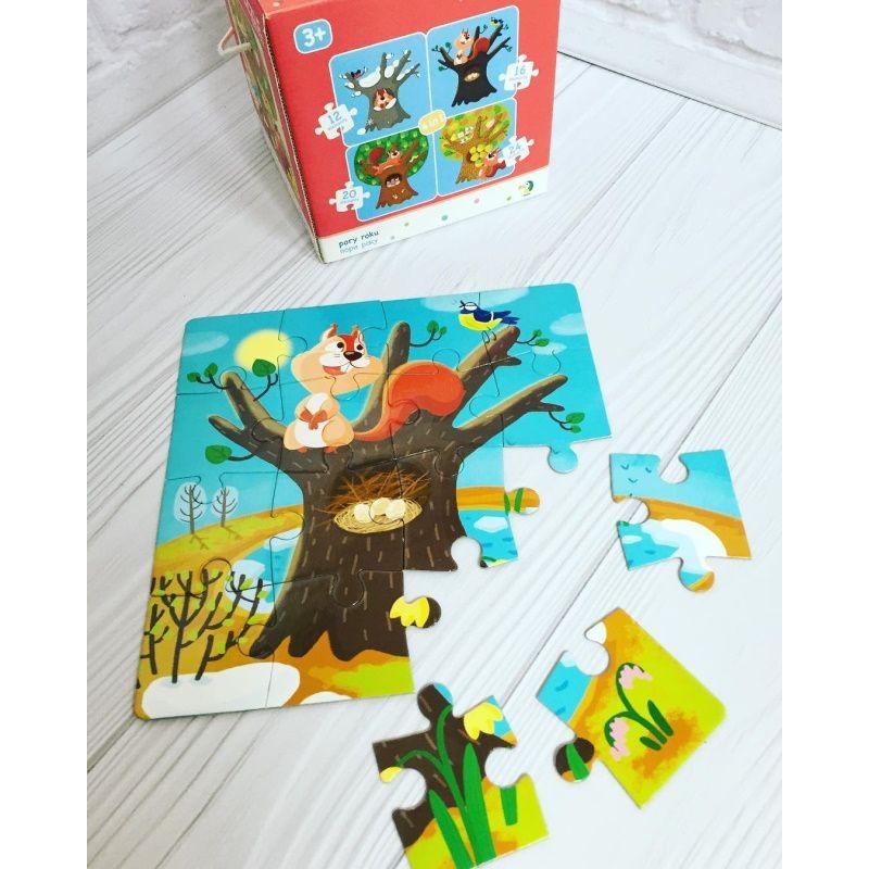 Dodo dėlionės vaikams Metų laikai (4 vnt.). Rinkinyje rasite 4 dėliones: 12, 16, 20, 24 elementų. Dėlionėse pagrindinis veikėjas voverytė, kurios pagalba vaizduojami visi keturi metų laikai.