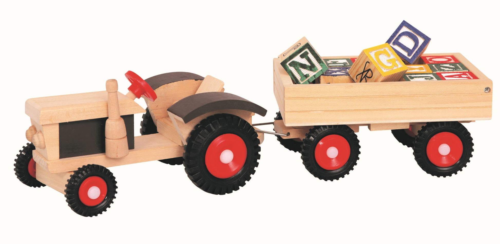 Medinis traktoriukas su priekaba ir kaladėlėmis