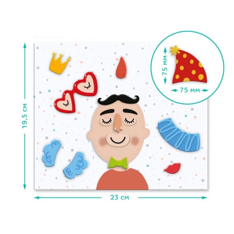 MON Magnetukų rinkinys Veidukai (61 el.). Rinkinyje rasite: 19,5x23 cm. lentą su veido konturu bei net 61 magnetukus (akytes, lupytes, kepures ir t.t.).
