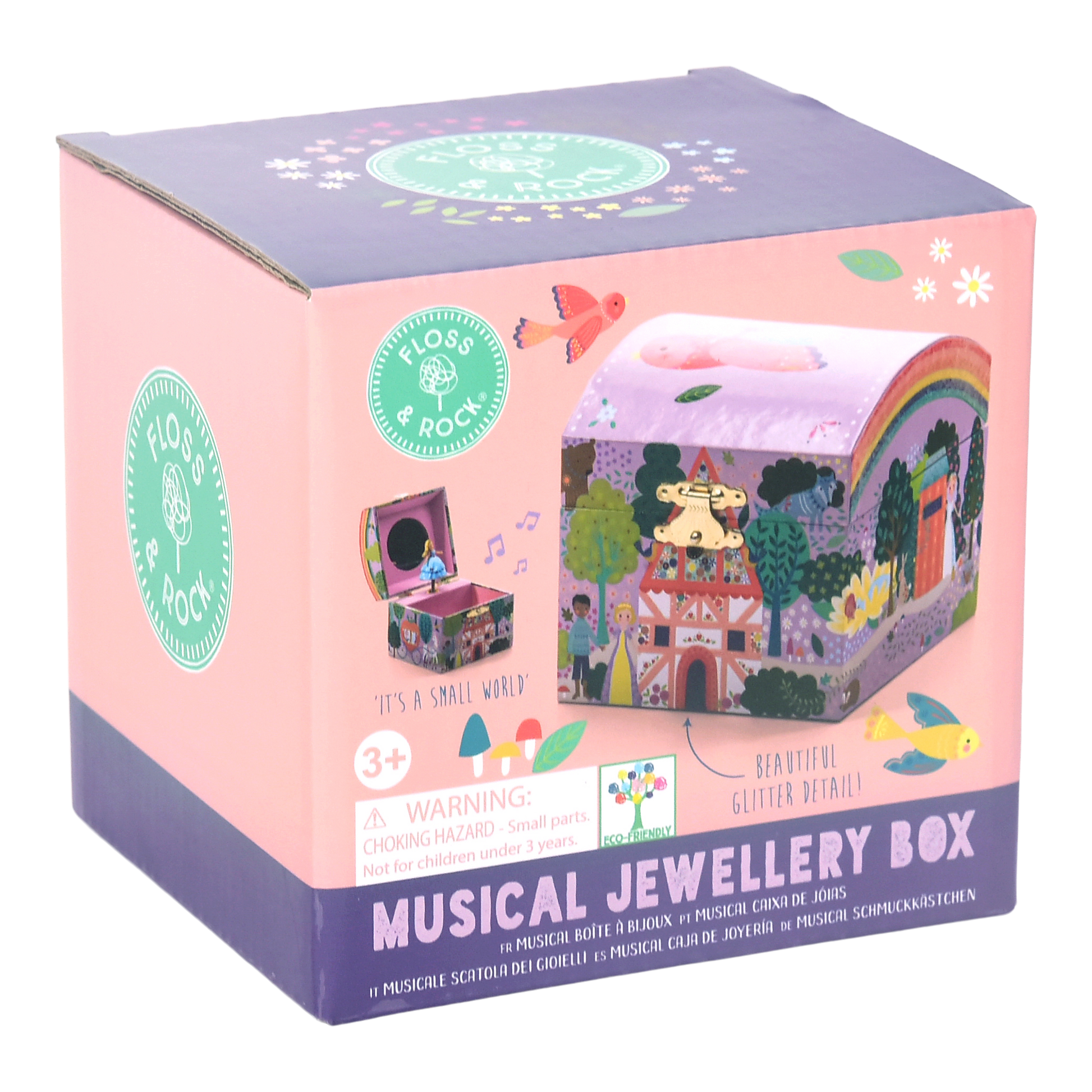 Pasukite raktelį ir atidarykite dangtelį, kad pamatytumėte kaip sukasi princesė pagal melodiją „It s a small world“.