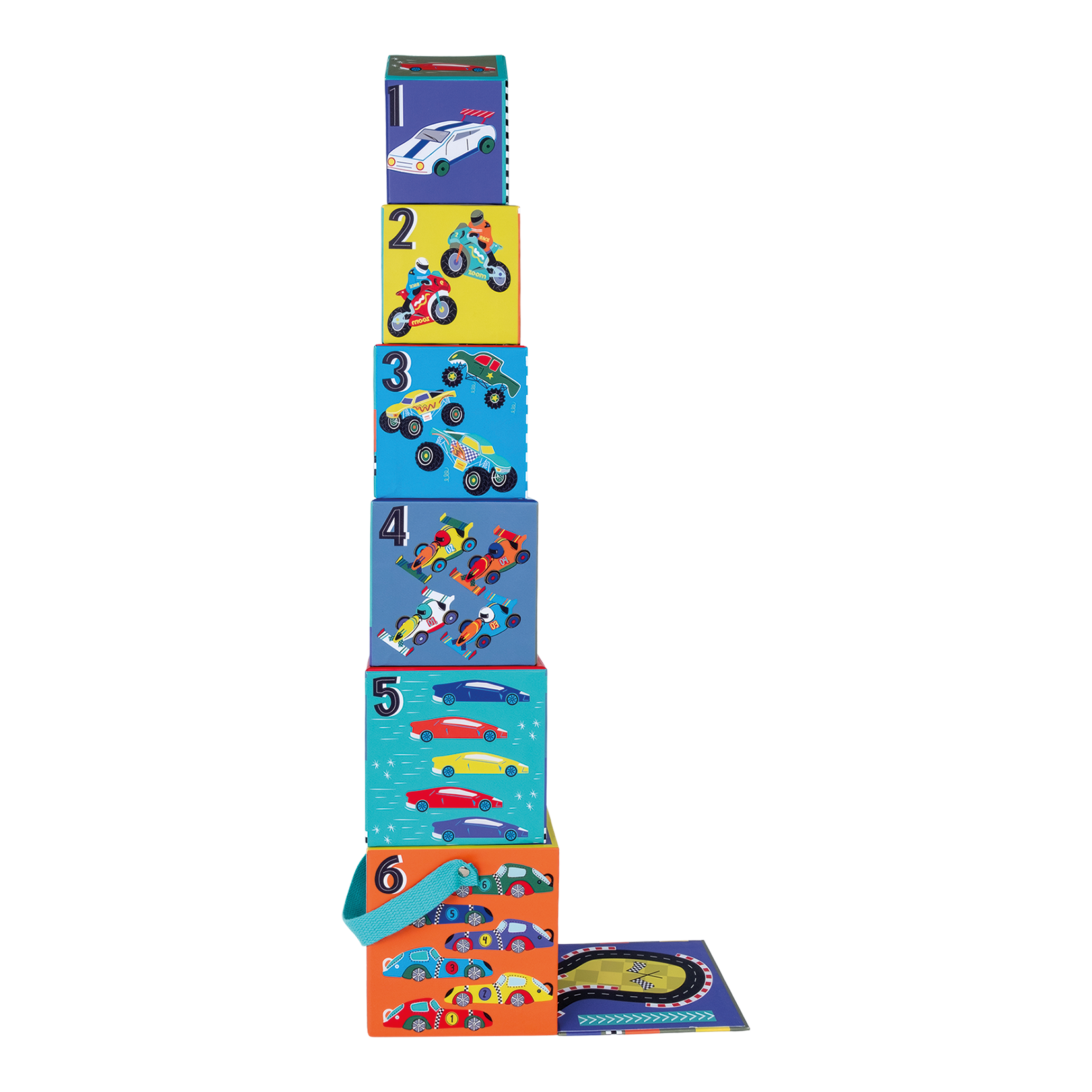 - 6 kubeliai su dailiomis iliustracijomis ir ant šono užrašytais skaičiais.