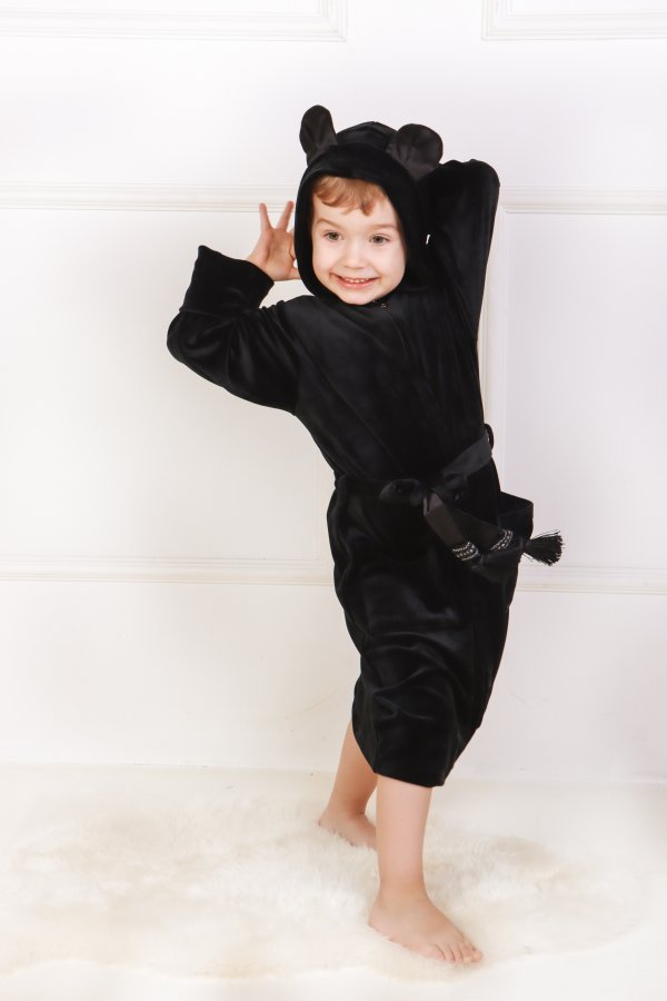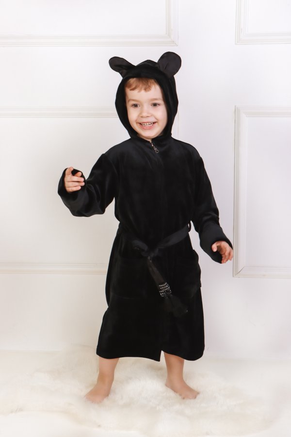 Vaikiškas juodas veliūrinis chalatas su užtrauktuku