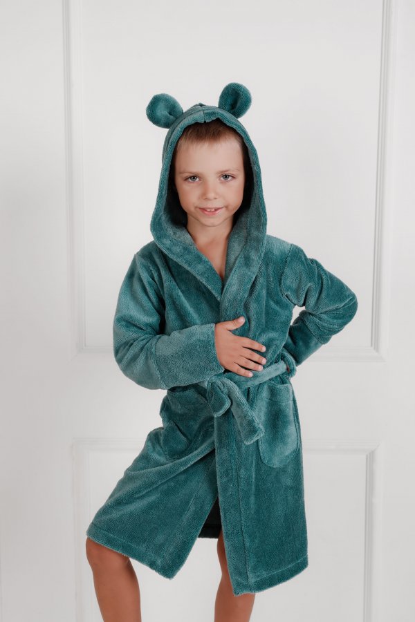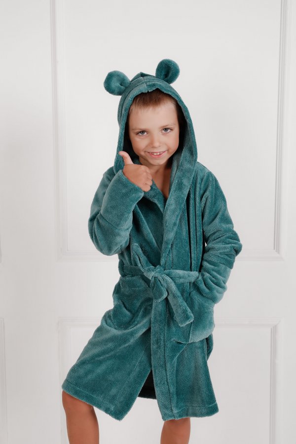 Žalias vaikiškas frotinis chalatas su gaubtuvu